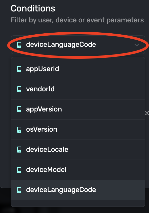 Conditions are added to this list when data is retrieved from the SDK via registering events or setting user attributes. If a condition doesn't yet exist in the drop down, you can manually add it by referencing it with dot syntax. For example, user.custom_parameter would reference custom_parameter on the user object. As with paywall text variables, the following objects are all available to use: